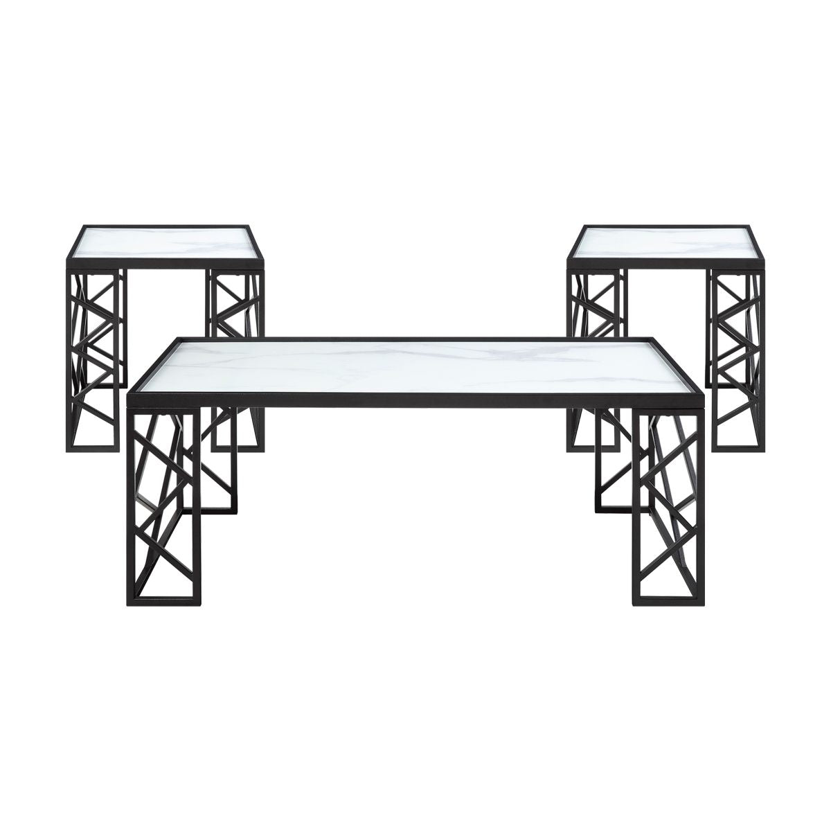 Black metal framing rises to support the white marble-print tempered-glass tops of the Astral Collection, the frames intersecting lines creating a distinctly modern profile for your living room. The collection is conveniently packaged to include a cocktail table, and two end tables.