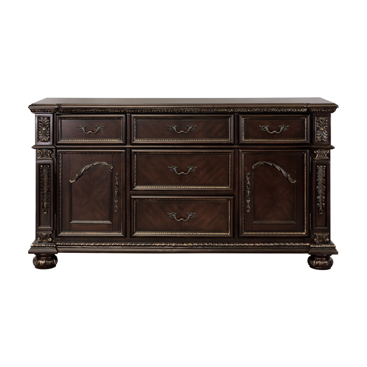 Old-World European styling is captured in the dramatically elegant Catalonia Collection. Traditional design elements reign at every turn egg and dart molding, acanthus leaf carving, bead molding, gold tipping and extravagant carvings creating a sophisticated look for your dining room. Each drawer front of the server features fixed-drop hardware with decorative flourish that furthers the elegant appointments.