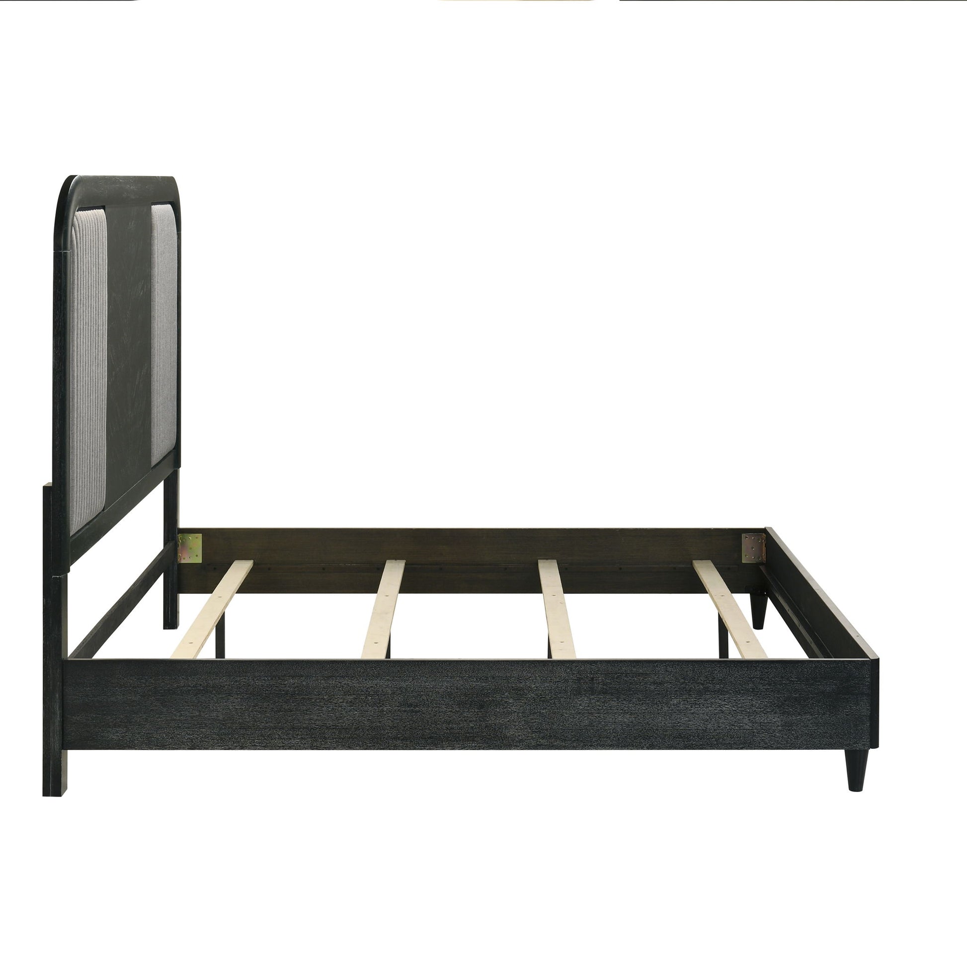 The Skyline Bedroom Set blends modern style with durability. Crafted from solid Rubberwood, engineered woods, and Ash veneers, it features a finish with gray glazing that enhances the wood grain. The upholstered panel bed adds plush comfort, while textured gray ribbed fabric contrasts with the dark wood. Spacious drawers with dovetail joinery and ball-bearing glides ensure smooth storage. A built-in USB port in the nightstand and a sleek mirror complete the set.