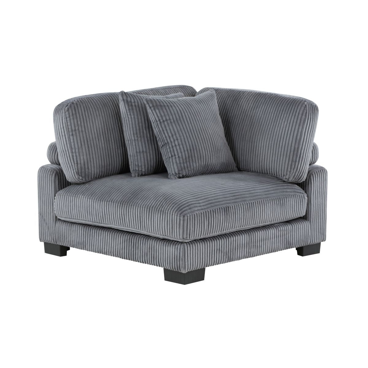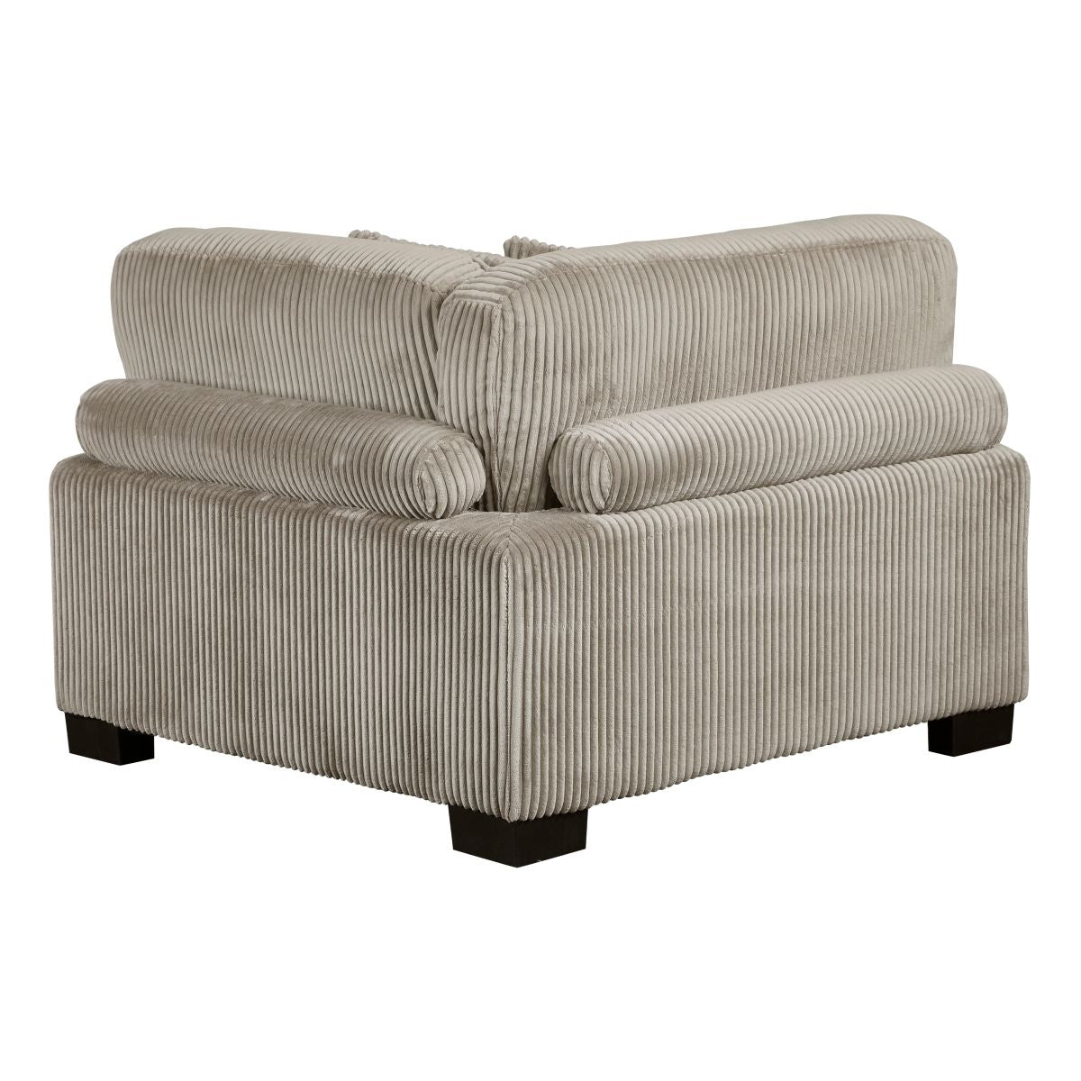 Configurable to your available space, the Traverse Collection allows for the addition and detachment of pieces for a customized seating experience. The sectional configuration consists of two corner units paired with two armless chairs. The plush beige corduroy fabric upholstery creates a plush expanse for a soft touch experience. The corner seat features two toss pillows, adjustable back and arm rest, and reversible cushions. The armless chair features a lumbar pillow, and reversible cushions.